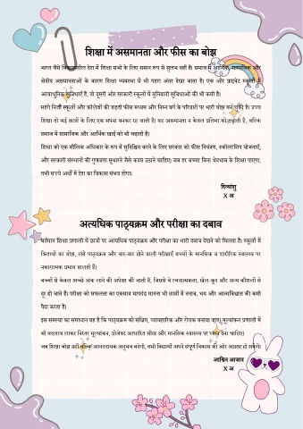 वतयमान लशक्षा प्रणाली म छािों पर अत्र्लधक पाठ्र्क्रम और परीक्षा का भारी दबाव देखने को लमलता है। स्क ूलों म ें